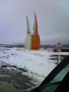 写真は紋別名物のカニのハサミの巨大オブジェ