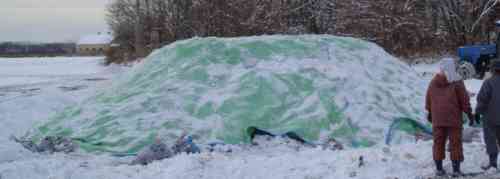 最終出荷前日に山積状態のビートの上(緑のカバーの上に)に積もった雪を落とす作業を行いました