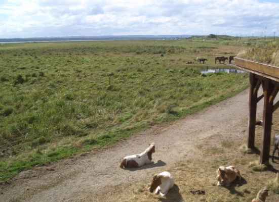 ・内陸側の原始状態の草原には馬が放牧されている